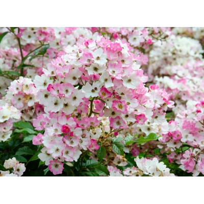 Во время цветения розовый куст покрывается небольшими цветками с белой серединкой и лепестками, которые меняют свой оттенок с темно-розового на светло-розовый, а затем на белый. Тычинки также меняют цвет с желтого на коричневый.